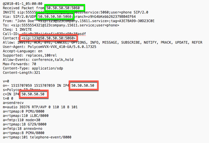 In the following image, we can see this is an INVITE from a Polycom VVX 410. We see the Public IP Address 5 times in this SIP message, but it is normal to see it in the 'Received packet from' and 'Via' Headers (indicated by Green). It should NOT be seen in the Contact Header or SDP body (Indicated by Red). 50.50.50.50 is a fictitious Public IP Address.