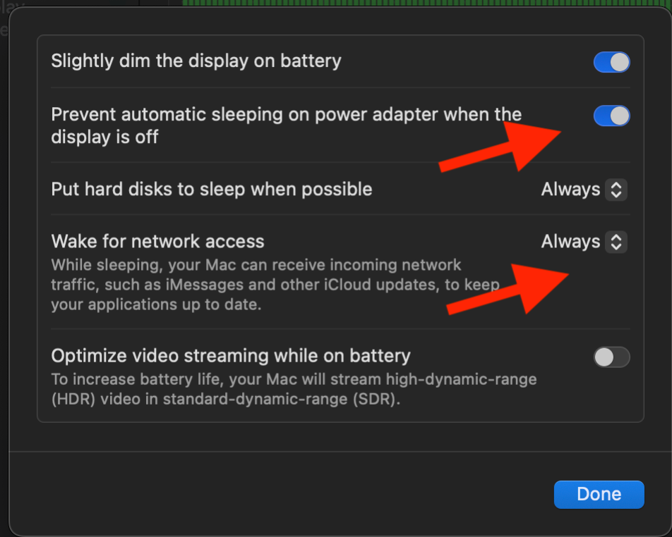 2. Click Options within Battery settings and enable 'Prevent automatic sleeping on power adapter when the display is off” and set the option “Wake for network access” to “Always”.