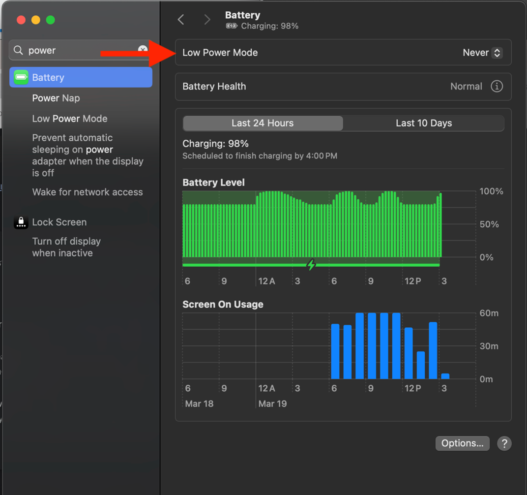 1. Within Battery settings, set Lower Power Mode to “Never”.