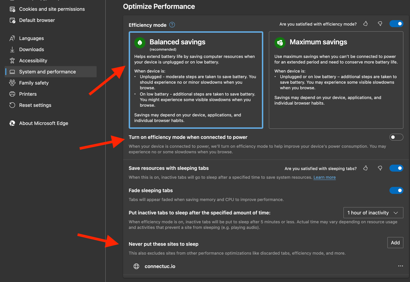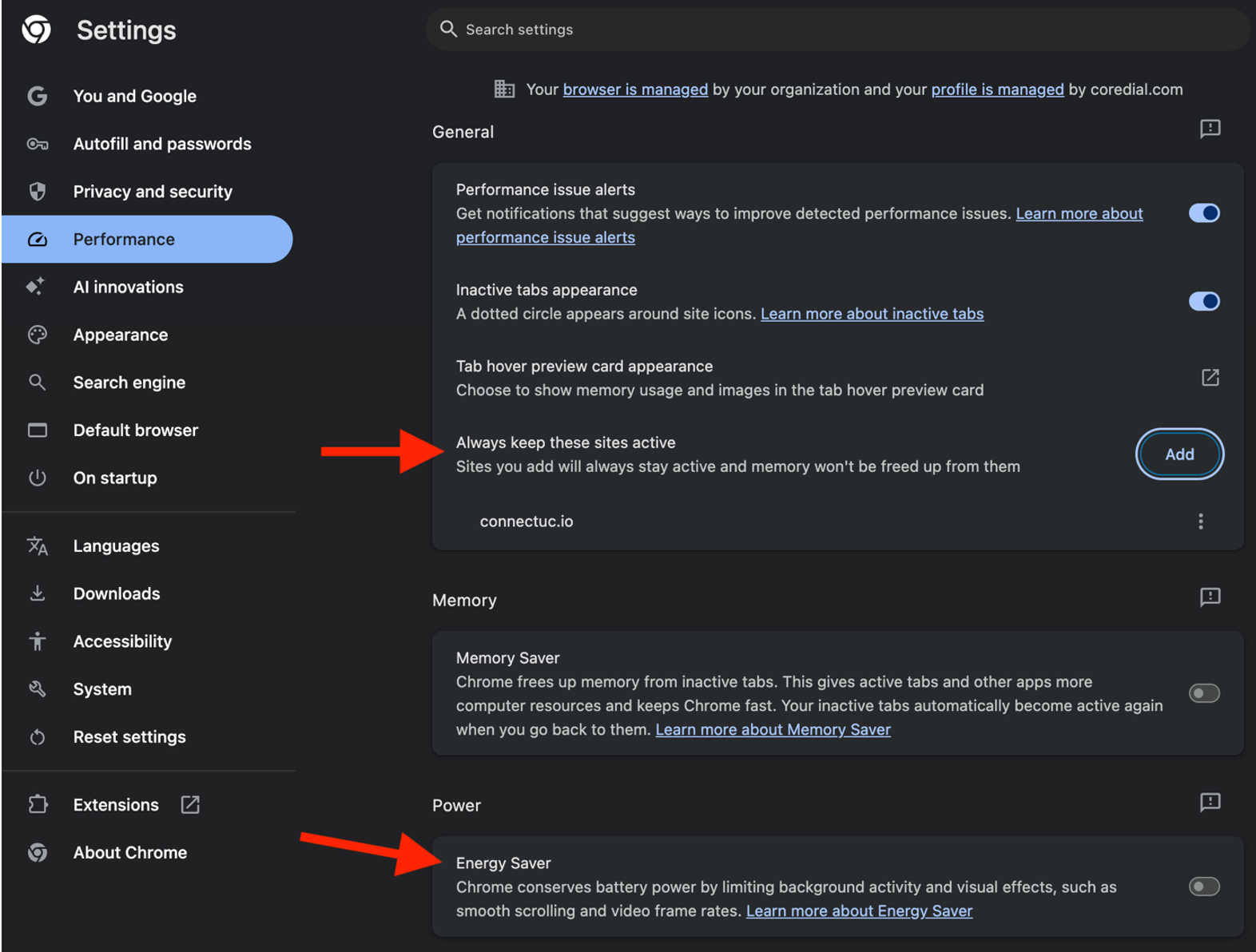1. Navigate to Settings > Performance and add “connectuc.io” or your branded domain to the section titled “Never put these sites to sleep”.